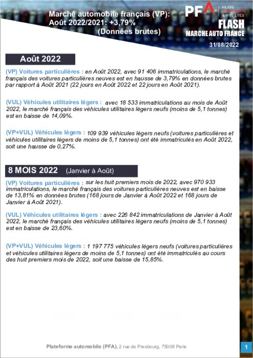 Au total, 91.403 voitures particulières sont sorties des concessions le mois dernier, soit 3,79% de plus qu'en août 2021, a indiqué jeudi la Plateforme automobile (PFA), qui représente les constructeurs et les équipementiers.