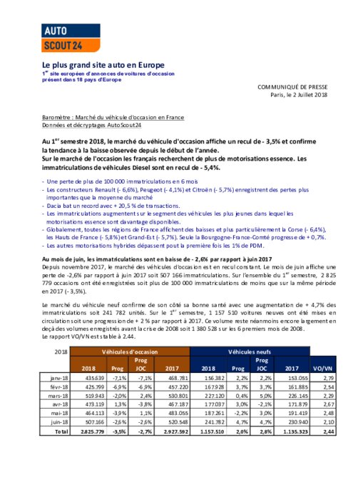Au 1er semestre 2018, le marché du véhicule d'occasion affiche un recul de - 3,5% et confirme la tendance à la baisse observée depuis le début de l'année. Sur le marché de l'occasion les français recherchent de plus de motorisations essence. Les immatriculations de véhicules Diesel sont en recul de - 5,4%.