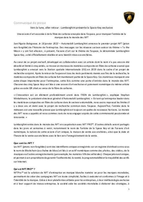 Automobili Lamborghini annonce le premier projet NFT (jeton non fongible) de l’histoire de l’entreprise. Des messages sur les réseaux sociaux autour du thème « To the Moon » y ont fait allusion ; à présent, l’œuvre d’art sur le thème de l’espace, la dénommée Lamborghini Space Key, a été officiellement révélée et sera bientôt mise aux enchères.