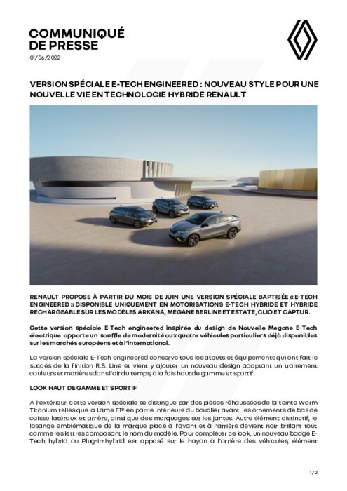 Renault propose à partir du mois de juin une version spéciale baptisée « E-Tech engineered » disponible uniquement en motorisations E-Tech hybride et hybride rechargeable sur les modèles Arkana, Megane Berline et Estate, Clio et Captur. Cette version spéciale E-Tech engineered inspirée du design de Nouvelle Megane E-Tech électrique apporte un souffle de modernité aux quatre véhicules particuliers déjà disponibles sur les marchés européens et à l’international.