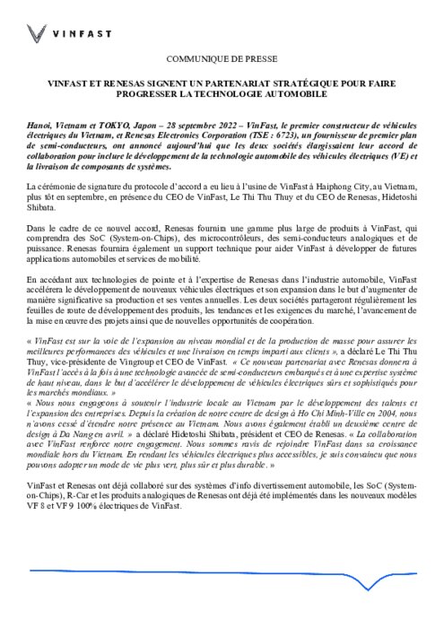 VinFast, le premier constructeur de véhicules électriques du Vietnam, et Renesas Electronics Corporation, un fournisseur de premier plan de semi-conducteurs, ont annoncé aujourd’hui que les deux sociétés élargissaient leur accord de collaboration pour inclure le développement de la technologie automobile des véhicules électriques (VE) et la livraison de composants de systèmes.