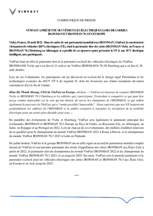 Dans le cadre de son partenariat mondial avec IRONMAN, VinFast, le constructeur vietnamien de véhicules 100% électriques (VE), était le partenaire titre des séries IRONMAN Vichy en France et IRONMAN 70.3 Duisburg en Allemagne et a profité de ces épreuves pour présenter le VF 8, son SUV électrique intelligent, aux participants.