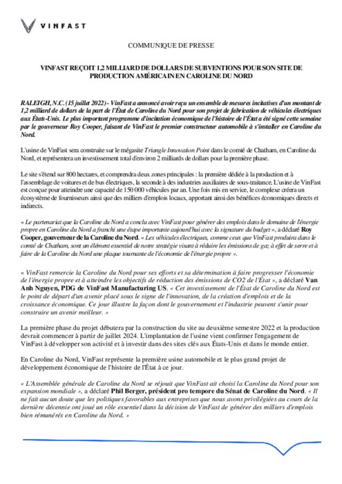 aux États-Unis. Le plus important programme d'incitation économique de l'histoire de l'État a été signé cette semaine par le gouverneur Roy Cooper, faisant de VinFast le premier constructeur automobile à s'installer en Caroline du Nord.