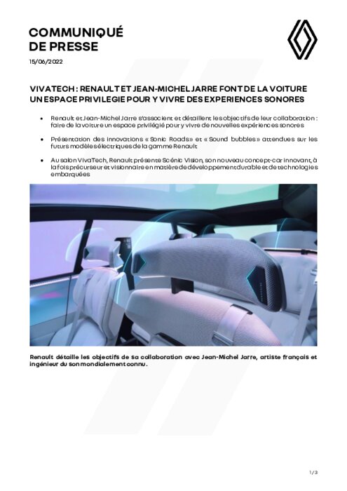 Renault et Jean-Michel Jarre s’associent et détaillent les objectifs de leur collaboration : faire de la voiture un espace privilégié pour y vivre de nouvelles expériences sonores. Présentation des innovations « Sonic Roads » et « Sound bubbles » attendues sur les futurs modèles électriques de la gamme Renault. Au salon VivaTech, Renault présente Scénic Vision, son nouveau concept-car innovant, à la fois précurseur et visionnaire en matière de développement durable et de technologies embarquées.