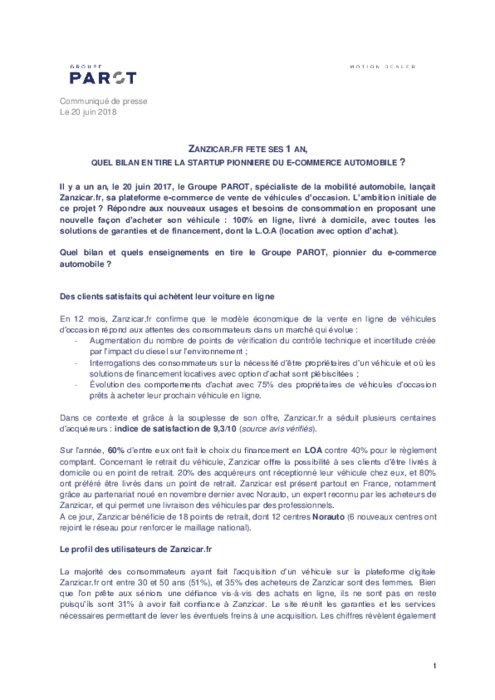 Il y a un an, le 20 juin 2017, le Groupe PAROT, spécialiste de la mobilité automobile, lançait Zanzicar.fr, sa plateforme e-commerce de vente de véhicules d’occasion. L’ambition initiale de ce projet ? Répondre aux nouveaux usages et besoins de consommation en proposant une nouvelle façon d’acheter son véhicule : 100% en ligne, livré à domicile, avec toutes les solutions de garanties et de financement, dont la L.O.A (location avec option d’achat).
