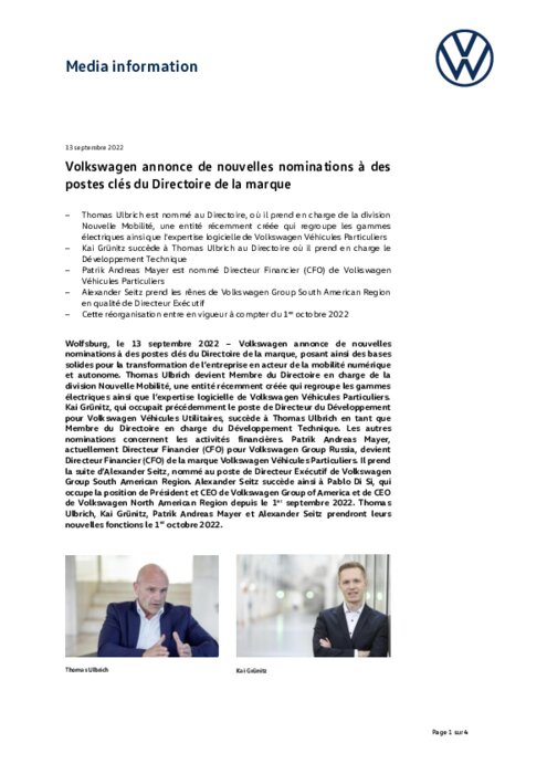 Volkswagen annonce de nouvelles nominations à des postes clés du Directoire de la marque, posant ainsi des bases solides pour la transformation de l’entreprise en acteur de la mobilité numérique et autonome. Thomas Ulbrich devient Membre du Directoire en charge de la division Nouvelle Mobilité, une entité récemment créée qui regroupe les gammes électriques ainsi que l’expertise logicielle de Volkswagen Véhicules Particuliers.