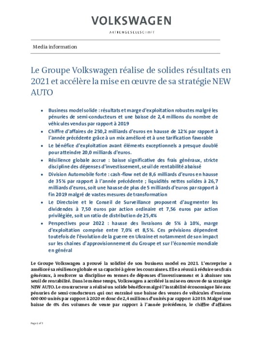 Pour 2022, le deuxième groupe automobile mondial prévoit une hausse de ses ventes entre 5% et 10%, avec un impact persistant de la pénurie de puces malgré une amélioration "progressive".