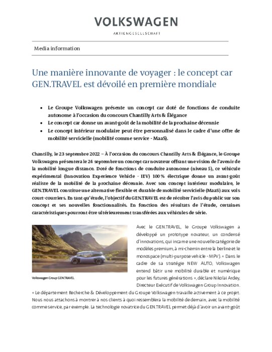 À l’occasion du concours Chantilly Arts & Élégance, le Groupe Volkswagen présentera le 24 septembre un concept car novateur offrant une vision de l’avenir de la mobilité longue distance. Doté de fonctions de conduite autonome (niveau 5), ce véhicule expérimental (Innovation Experience Vehicle - IEV) 100 % électrique donne un avant-goût réaliste de la mobilité de la prochaine décennie.