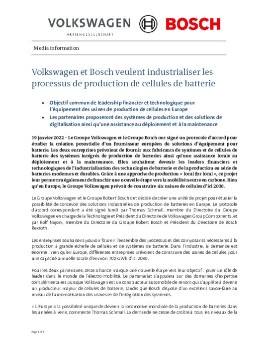 "Volkswagen et Bosch ont signé un protocole d'accord afin d'étudier la création d'un fournisseur européen pour équiper les usines de cellules de batteries", ont-ils indiqué dans un communiqué. Une coentreprise devrait être créée "d'ici fin 2022", ont-ils ajouté.