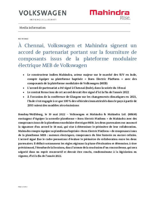 Volkswagen et Mahindra & Mahindra Ltd. (M&M) envisagent d’équiper la nouvelle plateforme « Born Electric Platform » de Mahindra avec des composants issus de la plateforme modulaire électrique MEB. Les deux partenaires ont annoncé la signature d'un accord le 18 mai, qui vise à déterminer le périmètre de leur collaboration. Mahindra compte équiper sa plateforme baptisée « Born Electric Platform » de composants issus de la plateforme MEB : moteurs électriques, composants du bloc-batterie.