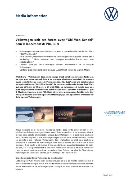 Volkswagen donne une charge émotionnelle encore plus forte à sa marque ainsi qu’un nouvel élan à sa stratégie électrique mondiale. La marque ouvre les activités de vente de l’emblématique ID. Buzz avec une collaboration exceptionnelle avec "Obi-Wan Kenobi", la toute nouvelle série limitée Star Wars qui sera diffusée sur Disney+ le 27 mai 2022. La campagne est lancée avec une publicité personnalisée réalisée en collaboration avec Lucasfilm et Industrial Light & Magic mettant en scène l'ID. Buzz.