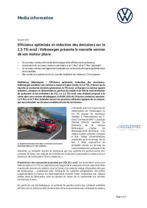 Efficience optimisée, réduction des émissions : Volkswagen améliore son moteur à essence le plus vendu, le 1.5 TSI, et lance sur le marché sa version de dernière génération, le TSI evo2, en Europe. Ce moteur quatre cylindres, compact et ultramoderne, permet de réduire à la fois la consommation de carburant et les émissions de CO2. Le 1.5 TSI evo2 sera d'abord proposé à la vente dans une version développant 110 kW (150 ch). D'autres variantes suivront.
