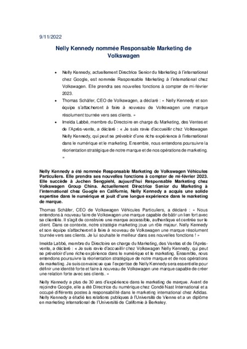 Nelly Kennedy a été nommée Responsable Marketing de Volkswagen Véhicules Particuliers. Elle prendra ses nouvelles fonctions à compter de mi-février 2023. Elle succède à Jochen Sengpiehl, aujourd’hui Responsable Marketing chez Volkswagen Group China. Actuellement Directrice Senior du Marketing à l’international chez Google en Californie, Nelly Kennedy a acquis une solide expertise dans le numérique et jouit d’une longue expérience dans le marketing de marque.