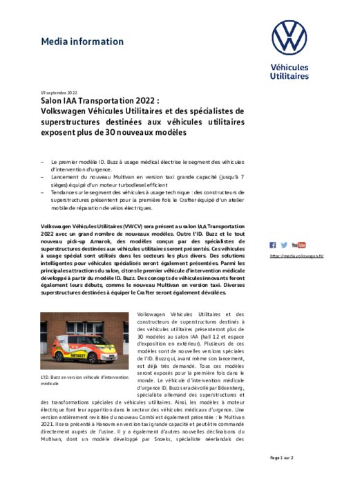 Volkswagen Véhicules Utilitaires (VWCV) sera présent au salon IAA Transportation 2022 avec un grand nombre de nouveaux modèles. Outre l’ID. Buzz et le tout nouveau pick-up Amarok, des modèles conçus par des spécialistes de superstructures destinées aux véhicules utilitaires seront présentés. Ces véhicules à usage spécial sont utilisés dans les secteurs les plus divers.