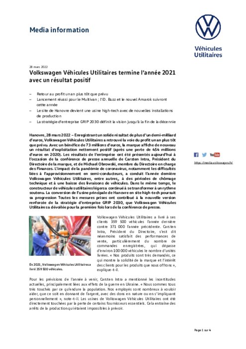 Enregistrant un solide résultat de plus d’un demi-milliard d’euros, Volkswagen Véhicules Utilitaires a retrouvé la voie du profit un an plus tôt que prévu. Avec un bénéfice de 73 millions d’euros, la marque affiche de nouveau un résultat d’exploitation nettement positif (après une perte de 454 millions d’euros en 2020)...