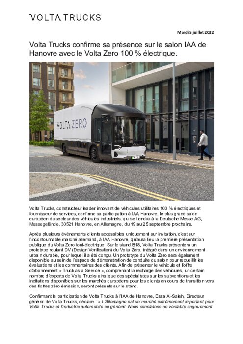 Volta Trucks, constructeur leader innovant de véhicules utilitaires 100 % électriques et fournisseur de services, confirme sa participation à IAA Hanovre, le plus grand salon européen du secteur des véhicules industriels, qui se tiendra à la Deutsche Messe AG, Messegelände, 30521 Hanovre, en Allemagne, du 19 au 25 septembre prochains.