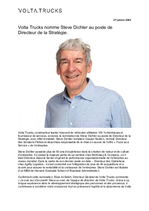 Volta Trucks, constructeur leader innovant de véhicules utilitaires 100 % électriques et fournisseur de services, annonce la nomination de Steve Dichter au poste de Directeur de la Stratégie, avec effet immédiat. Steve Dichter remplace Casper Norden, nommé Directeur des Solutions Flottes et désormais responsable de la mise en œuvre de l’offre « Truck as a Service » de l’entreprise.