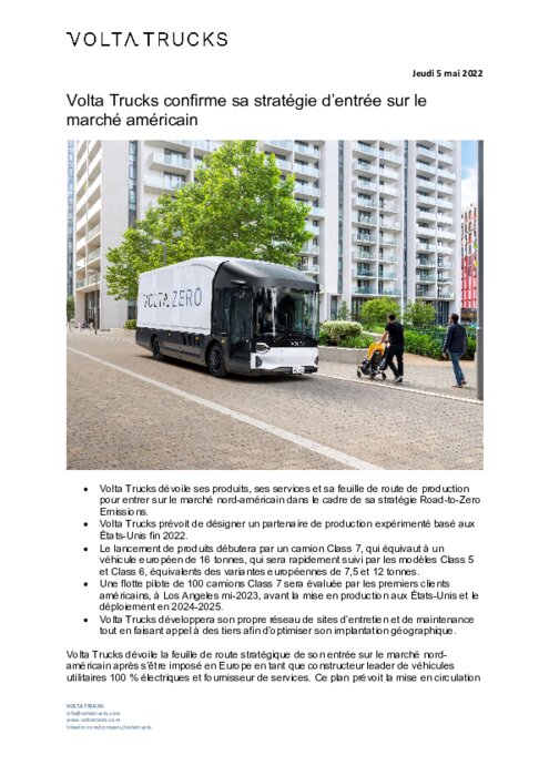 Volta Trucks dévoile ses produits, ses services et sa feuille de route de production pour entrer sur le marché nord-américain dans le cadre de sa stratégie Road-to-Zero Emissions. Volta Trucks prévoit de désigner un partenaire de production expérimenté basé aux États-Unis fin 2022.