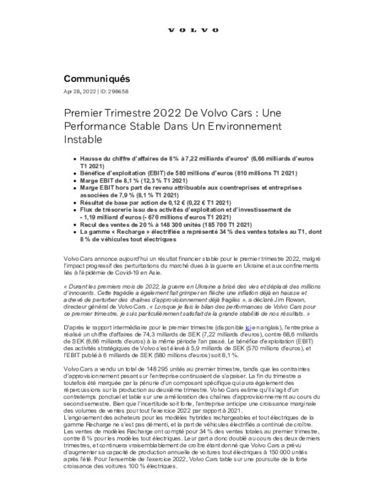 "Volvo Cars considère qu'il s'agit d'un revers temporaire et s'attend à ce que les chaînes d'approvisionnement s'améliorent au second semestre", indique-t-il dans son rapport.