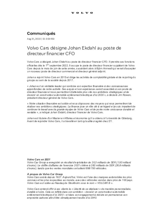 Volvo Cars : Johan Ekdahl nommé directeur financier CFO