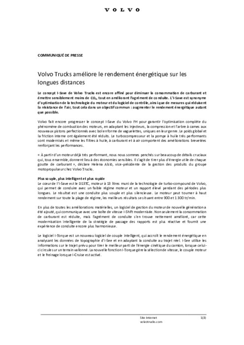 Le concept I-Save de Volvo Trucks est encore affiné pour diminuer la consommation de carburant et émettre sensiblement moins de CO2, tout en améliorant l’agrément de conduite. L’I-Save est synonyme d’optimisation de la technologie du moteur et du logiciel de contrôle, ainsi que de mesures qui réduisent la résistance de l’air, tout cela dans un objectif commun : augmenter le rendement énergétique autant que possible.