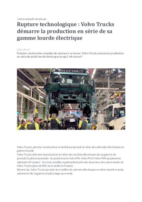 Volvo Trucks, premier constructeur mondial qui produit en série des véhicules électriques en gamme lourde. Volvo Trucks démarre la production en série des versions électriques de sa gamme de