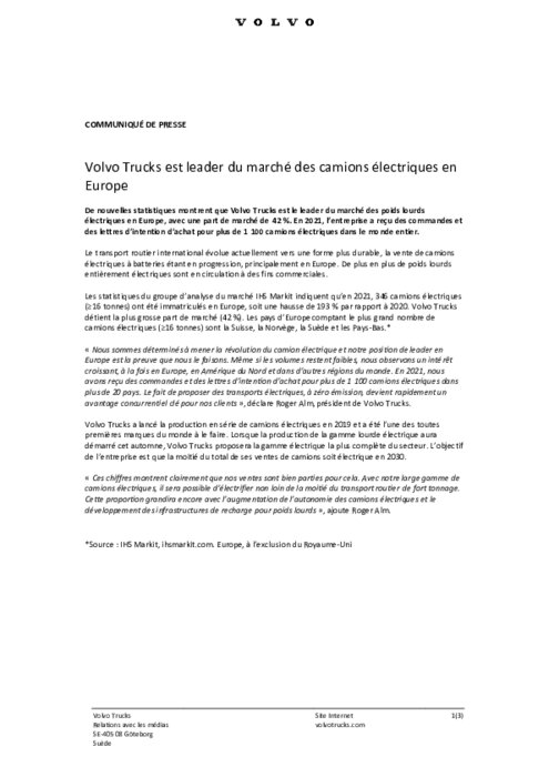 De nouvelles statistiques montrent que Volvo Trucks est le leader du marché des poids lourds électriques en Europe, avec une part de marché de 42 %. En 2021, l’entreprise a reçu des commandes et des lettres d’intention d’achat pour plus de 1 100 camions électriques dans le monde entier.