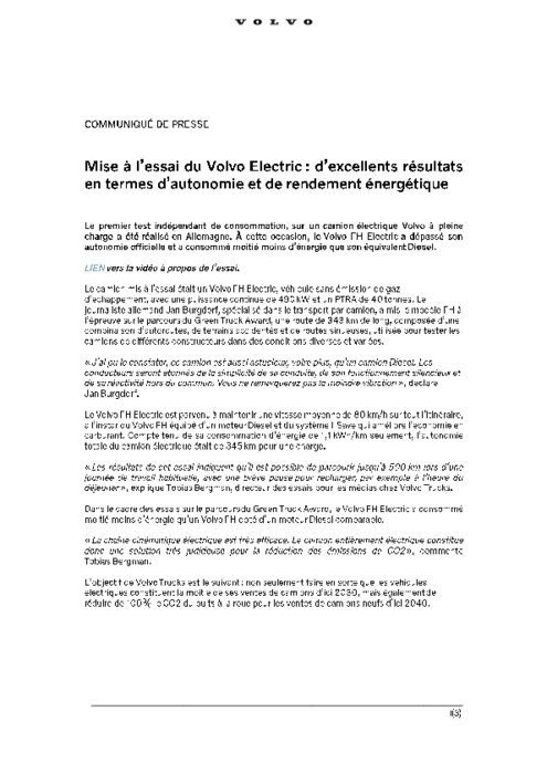 Le premier test indépendant de consommation, sur un camion électrique Volvo à pleine charge a été réalisé en Allemagne. À cette occasion, le Volvo FH Electric a dépassé son autonomie officielle et a consommé moitié moins d’énergie que son équivalent Diesel.