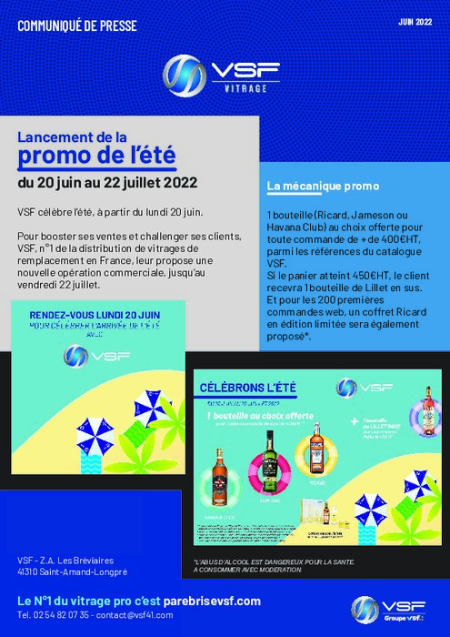 Distributeurs 06 juin 2022 - 15:02 VSF célèbre l’été, à partir du lundi 20 juin. Pour booster ses ventes et challenger ses clients, VSF, n°1 de la distribution de vitrages de remplacement en France, leur propose une nouvelle opération commerciale, jusqu’au vendredi 22 juillet. PDF (3 Mo) Télécharger