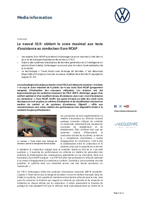 Les technologies d'assistance dernier cri de l’ID.5 ont obtenu la mention « très bien » et reçu le score maximal de 4 points sur 4 aux tests Euro NCAP (programme européen d'évaluation des nouveaux véhicules). Les testeurs ont été impressionnés par les systèmes novateurs de l’ID.5 100 % électrique, gages d’un confort optimal et d’un excellent niveau d'assistance. Avec son « test d’assistance